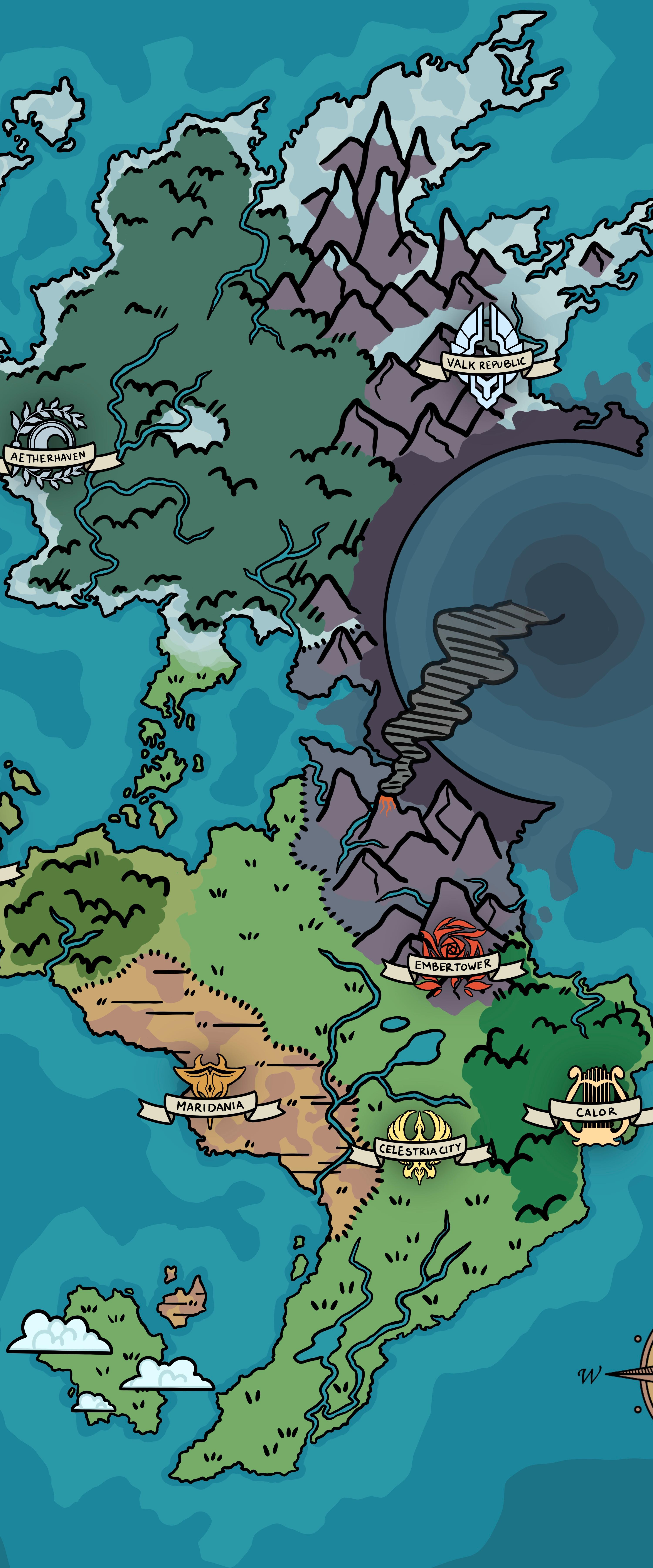 Celestria is a region characterized by its strong winds, as well as its rolling hills and grassy plains, with a network of crystal clear rivers and lakes running throughout. It is home to many settlements, as well as Celestria City, the region’s resident city-state. The region is considered a low-level threat zone, with relatively weak monsters and traversable terrain, making settlement and travel safe and affordable to most of its inhabitants.